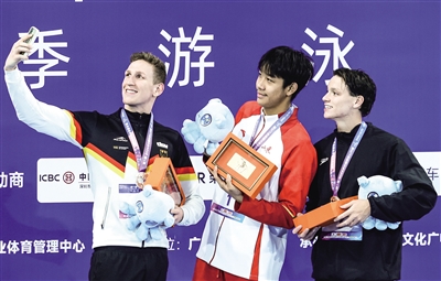 3月19日,在广东深圳举行的2026年中国游泳公开赛男子200米自由泳比赛中,张展硕夺得冠军。图为当日,冠军张展硕(中)、亚军梅尔滕斯(左)和季军彼得里奇在颁奖仪式上。 新华社发