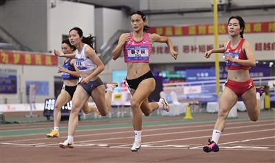 3月27日,2026年全国室内田径锦标赛在山东省济南市开赛。图为当日,晋级决赛的广东队选手蔡子娴(右二)在女子60米预赛中。
