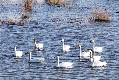 近日,在新荣区赵家窑水库上游的淤泥河湿地,成群的大天鹅或悠然游弋于碧波之上,或振翅翱翔于晴空之间,为这片塞北湿地绘就了一幅灵动的生态画卷。