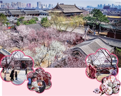 图为市民游客在关帝庙赏花拍照。
