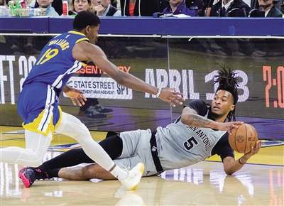 当地时间4月1日,在2025-2026赛季NBA常规赛中,金州勇士队主场以113∶127不敌圣安东尼奥马刺队。图为马刺队球员斯蒂芬·卡斯尔(右)在比赛中拼抢。 新华社发