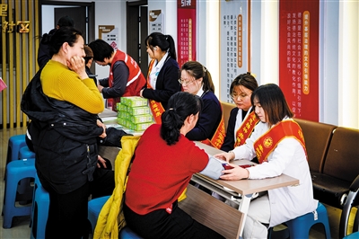 图为医护人员为居民免费测血压。