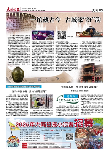 从杏花村酒乡到大同古城,玉珠酒店以汾酒博物馆为纽带,打通传统酒文化与现代文旅的连接通道,推动汾酒与大同文旅双向赋能,以“酒+文旅+文化”的模式丰富了大同古城的文化内涵,让千年汾酒清香与古都文脉共启文旅融合新征程。