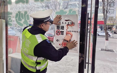 活动中,民辅警走进酒店、餐馆,在餐桌、收银台等醒目位置张贴“守法不酒驾,安全千万家”“拒绝酒驾,你参与更精彩”等温馨提示语,引导餐饮从业人员及就餐群众树立安全意识,拒绝酒驾。