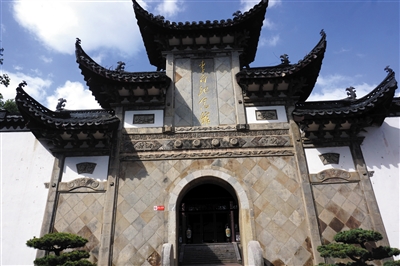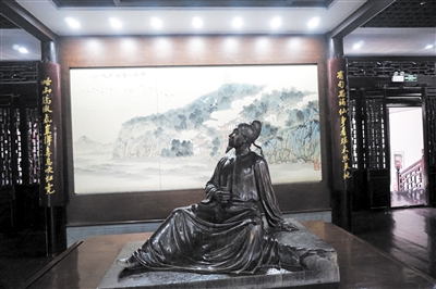 转过树林,忽见楼群依山而建,高低错落,蔚为壮观。走进李白纪念馆,迎面是范曾先生根据李白《梦游天姥吟留别》创作的一幅瓷砖壁画。画中深谷万丈,苍松奇崛,呦呦鹿鸣,李白头戴斗笠,倚躺石上,那种“安能摧眉折腰事权贵,使我不得开心颜”的愤懑之气、不向权贵低头的人格跃然画上。这里陈列了各种版本的《李太白全集》,还藏有李白手迹《上阳台帖》的复制件,让我大开眼界。没想到诗仙不仅文采飞扬,书法也令人称道。我仿佛看到他挥毫泼墨,写下那些不朽诗篇的情景。