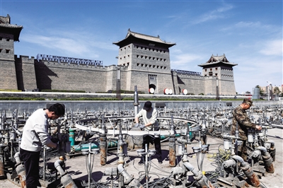 图为 11 日,工作人员正在检修喷泉设施。 本报记者 戎禹仁 摄