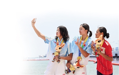 新华社三亚4月25日电 25日,阳光明媚的三亚湾见证两面五星红旗同时升起——第六届亚沙会公开水域游泳项目开赛,同为18岁的中国双姝李馨璇和陈奕静包揽女子5公里金、银牌。